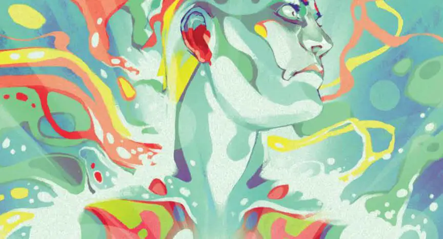 The graphic novel, co-written by Barker and Mark Alan Miller, opens with billionaire jerk Julian Demond uncovering a mysterious pyramid. When he sledge hammers it open, a mysterious being comes out. It’s humanoid in form, but staggeringly tall compared to the already large Julian. It’s skin is rainbow colored. The way it stands—straight-backed, looming—calls back to Watchmen’s Dr. Manhattan. This character introduces itself: “I am Wick, the father of colors. I am the Lord your God.”