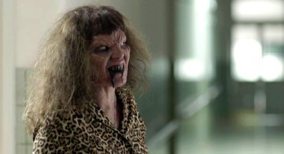 When Emanuel is called outside to address the press (all of whom think the shooting was perpetrated by “cartels” or “student cartels”), the camera goes across the street to Vasilio Canetti (Tobin Bell) in a hoodie, covered in satanic tattoos. The audience met him in a pre-credit voice over, where he informed them that “in 2010, reports of possessed people increased exponentially.”