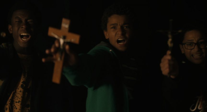 There’s a new-ish trope that’s been showing up a lot in recent movies that always make me cry. When the heroes of a film are in danger and the community the friends they’ve made along the way shows up behind them (no matter how outlandishly quiet those friends are before they appear all at once), I cry. We’ll leave the reasons why that gets me for my therapist, but Vampires vs. the Bronx had me bawling.